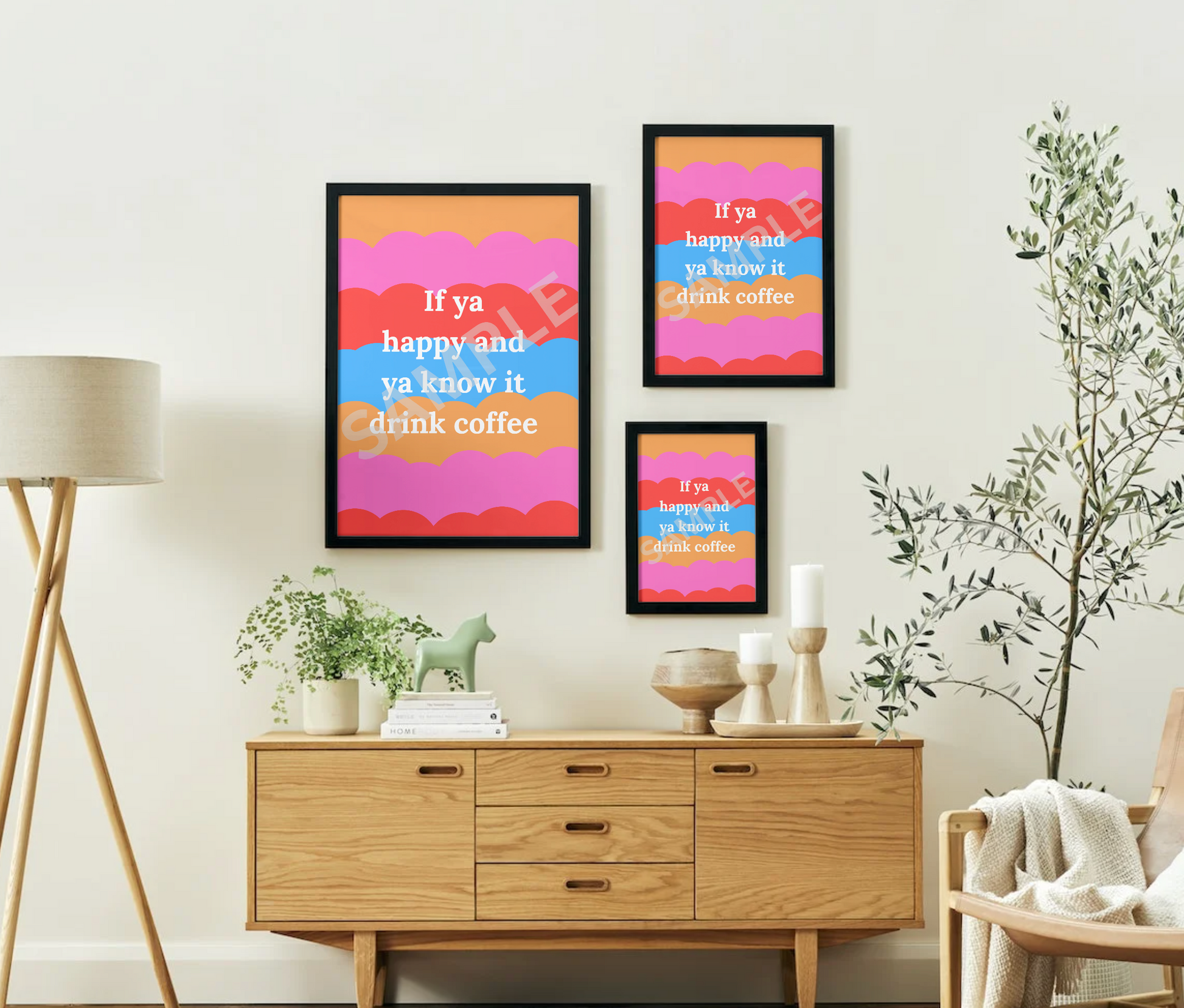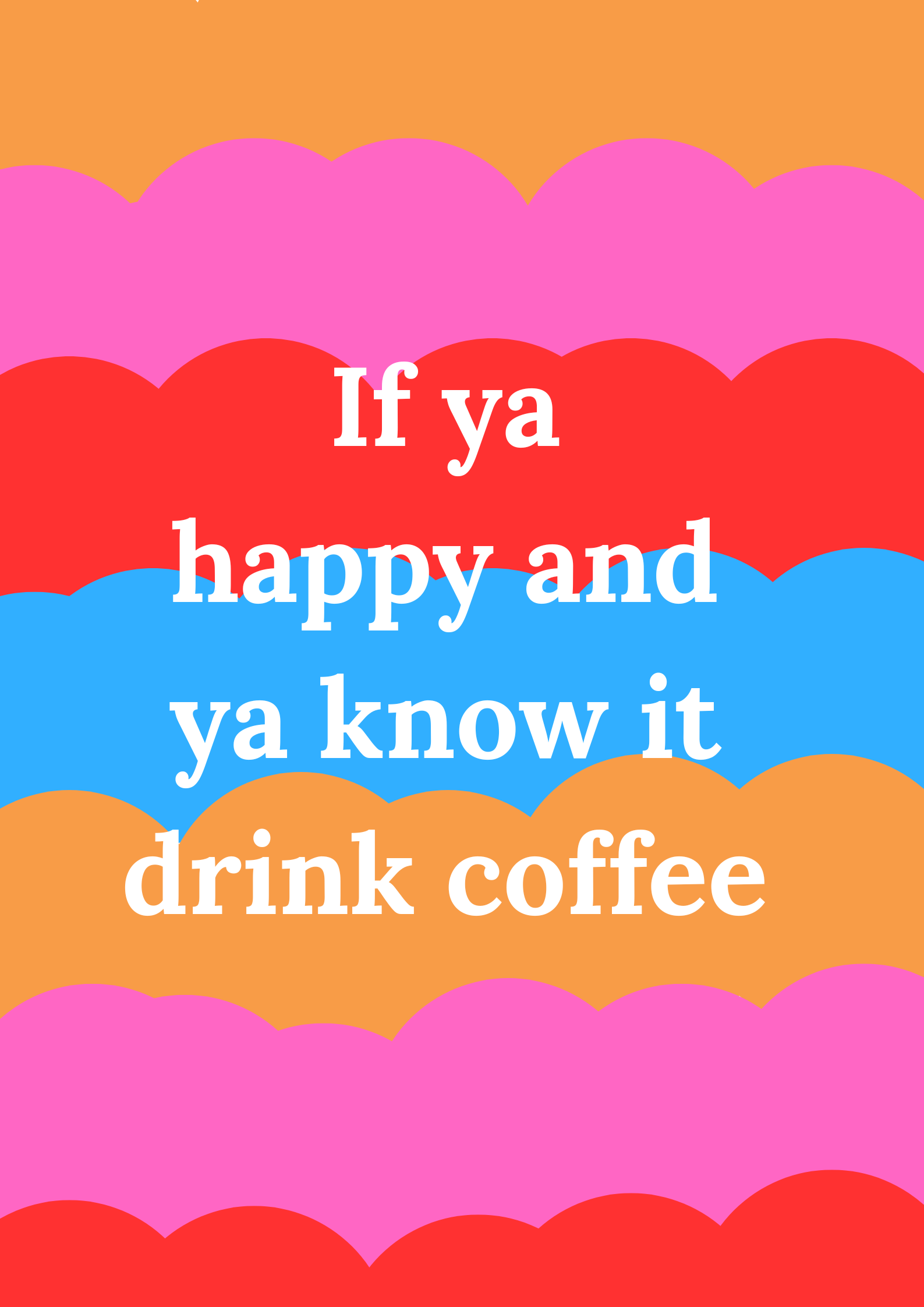 Liven up your walls with a splash of vibrant energy and fun in this colorful art print. Featuring spirited waves, it boldly shares the cheeky phrase, "If ya happy and ya know it drink coffee," adding a playful touch to any room.