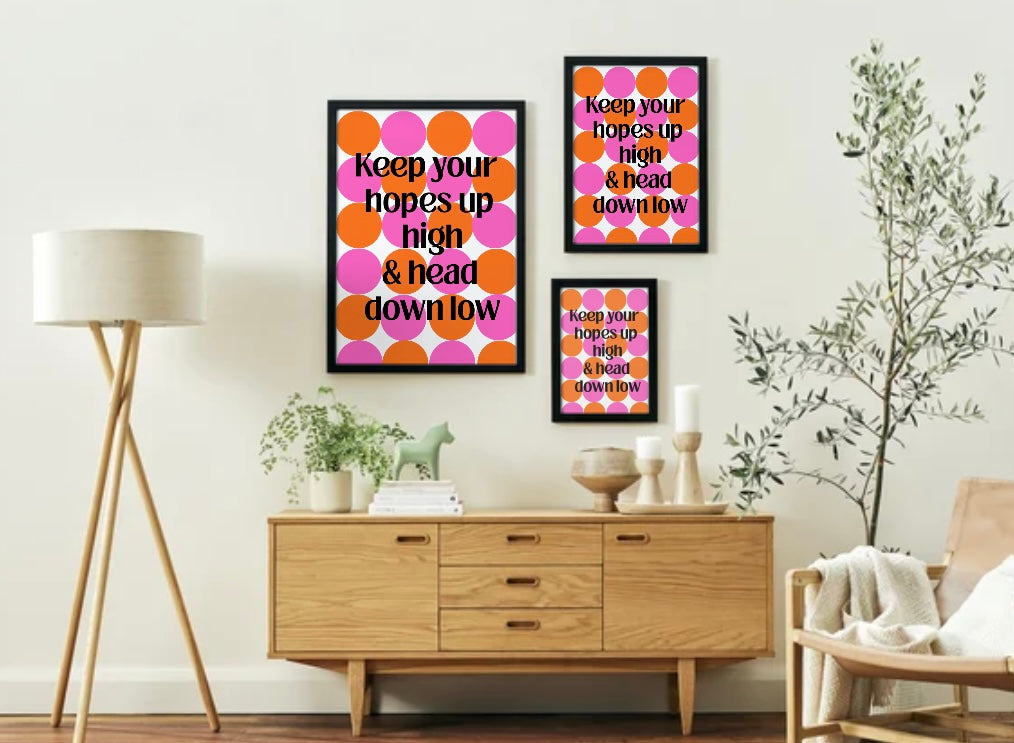 Brighten your space with this bold and inspiring wall art. Featuring vibrant pink and orange circle accents with striking black typography, this piece is a perfect balance of positivity and focus.